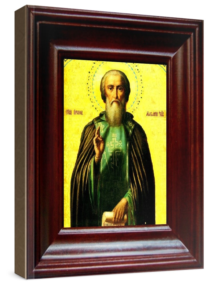 Икона макарий желтоводский (21х24), простой киот. Лик нанесен методом шелкографии на цельную липовую доску, покрытую левкасом (специальным грунтом под живопись). Использованы минеральные (природные) краски. Размер иконы без киота (см): 13х16, с киотом: 21х24. Киот со стеклом, выполнен из березы. Икона освящена.