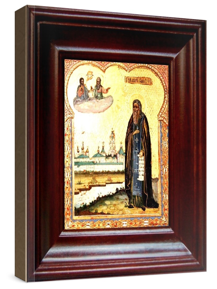 Икона макарий калязинский (21х24), простой киот. Лик нанесен методом шелкографии на цельную липовую доску, покрытую левкасом (специальным грунтом под живопись). Использованы минеральные (природные) краски. Размер иконы без киота (см): 13х16, с киотом: 21х24. Киот со стеклом, выполнен из березы. Икона освящена.