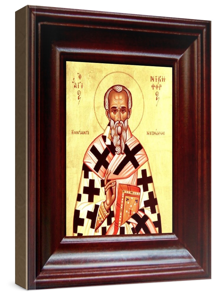 Икона никифор константинопольский (21х24), простой киот. Лик нанесен методом шелкографии на цельную липовую доску, покрытую левкасом (специальным грунтом под живопись). Использованы минеральные (природные) краски. Размер иконы без киота (см): 13х16, с киотом: 21х24. Киот со стеклом, выполнен из березы. Икона освящена.