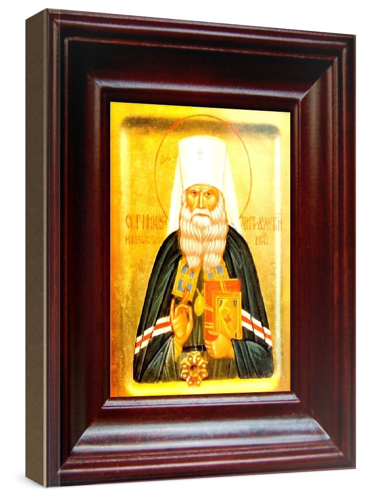 Икона николай алма-атинский (21х24), простой киот. Лик нанесен методом шелкографии на цельную липовую доску, покрытую левкасом (специальным грунтом под живопись). Использованы минеральные (природные) краски. Размер иконы без киота (см): 13х16, с киотом: 21х24. Киот со стеклом, выполнен из березы. Икона освящена.
