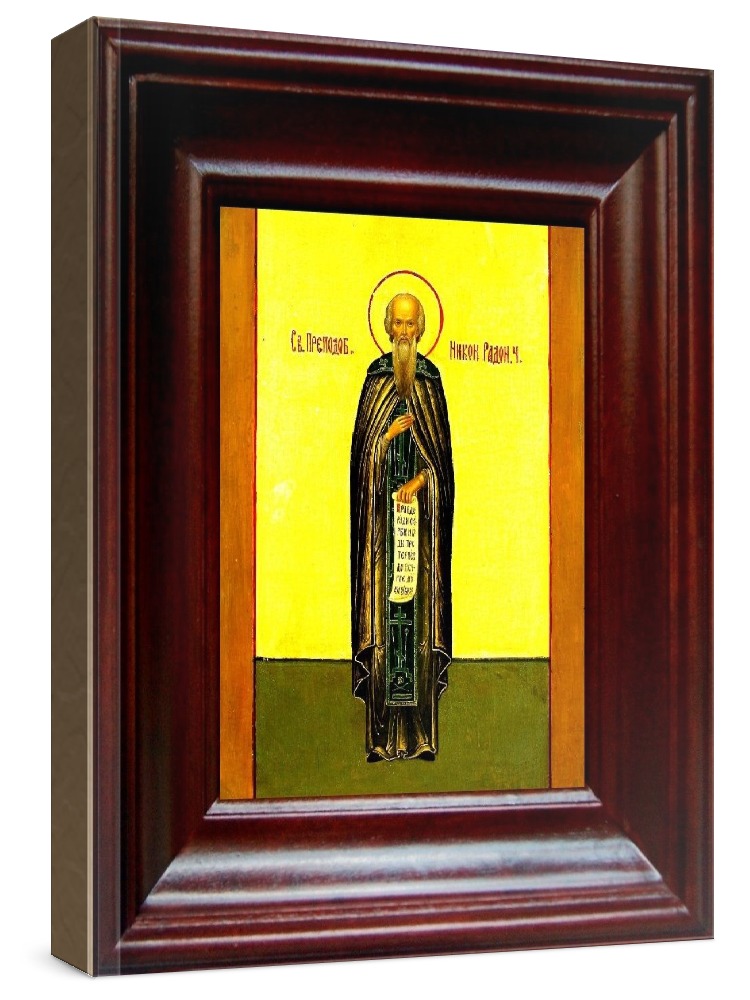 Икона никон радонежский (21х24), простой киот. Лик нанесен методом шелкографии на цельную липовую доску, покрытую левкасом (специальным грунтом под живопись). Использованы минеральные (природные) краски. Размер иконы без киота (см): 13х16, с киотом: 21х24. Киот со стеклом, выполнен из березы. Икона освящена.