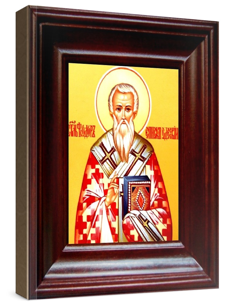 Икона феодор едесский (21х24), простой киот. Лик нанесен методом шелкографии на цельную липовую доску, покрытую левкасом (специальным грунтом под живопись). Использованы минеральные (природные) краски. Размер иконы без киота (см): 13х16, с киотом: 21х24. Киот со стеклом, выполнен из березы. Икона освящена.
