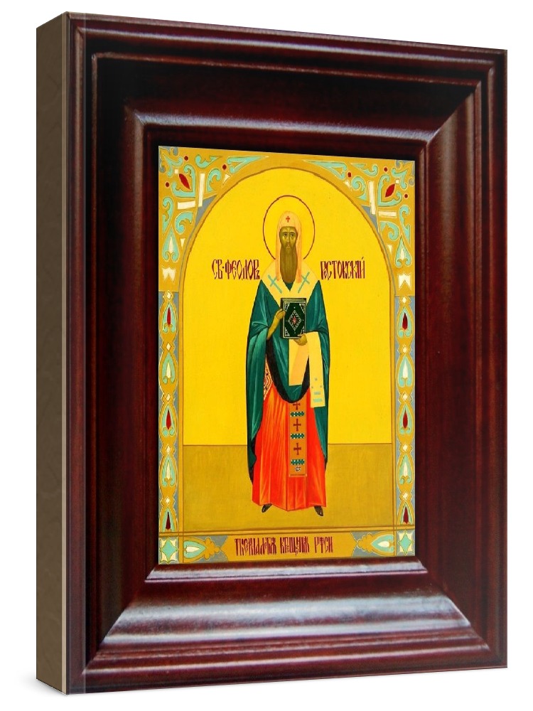 Икона феодор ростовский (21х24), простой киот. Лик нанесен методом шелкографии на цельную липовую доску, покрытую левкасом (специальным грунтом под живопись). Использованы минеральные (природные) краски. Размер иконы без киота (см): 13х16, с киотом: 21х24. Киот со стеклом, выполнен из березы. Икона освящена.