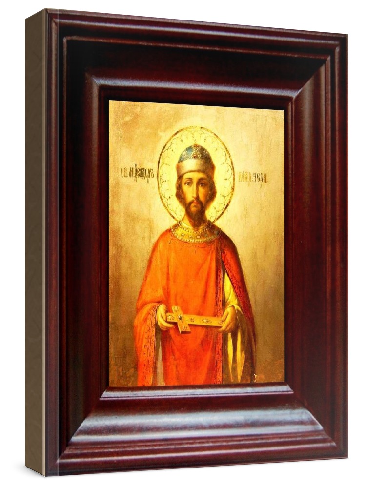 Икона феодор черниговский (21х24), простой киот. Лик нанесен методом шелкографии на цельную липовую доску, покрытую левкасом (специальным грунтом под живопись). Использованы минеральные (природные) краски. Размер иконы без киота (см): 13х16, с киотом: 21х24. Киот со стеклом, выполнен из березы. Икона освящена.