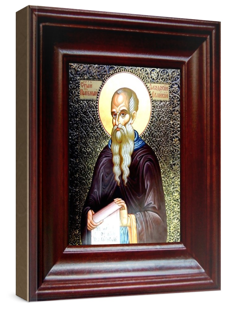 Икона феодосий великий (21х24), простой киот. Лик нанесен методом шелкографии на цельную липовую доску, покрытую левкасом (специальным грунтом под живопись). Использованы минеральные (природные) краски. Размер иконы без киота (см): 13х16, с киотом: 21х24. Киот со стеклом, выполнен из березы. Икона освящена.