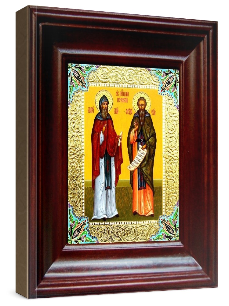 Икона феодосий и антоний печерские (21х24), простой киот. Лик нанесен методом шелкографии на цельную липовую доску, покрытую левкасом (специальным грунтом под живопись). Использованы минеральные (природные) краски. Размер иконы без киота (см): 13х16, с киотом: 21х24. Киот со стеклом, выполнен из березы. Икона освящена.