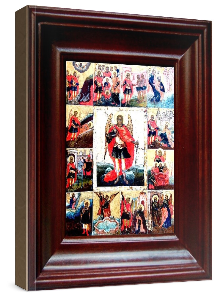 Икона архангел михаил с деяниями (21х24), простой киот. Лик нанесен методом шелкографии на цельную липовую доску, покрытую левкасом (специальным грунтом под живопись). Использованы минеральные (природные) краски. Размер иконы без киота (см): 13х16, с киотом: 21х24. Киот со стеклом, выполнен из березы. Икона освящена.