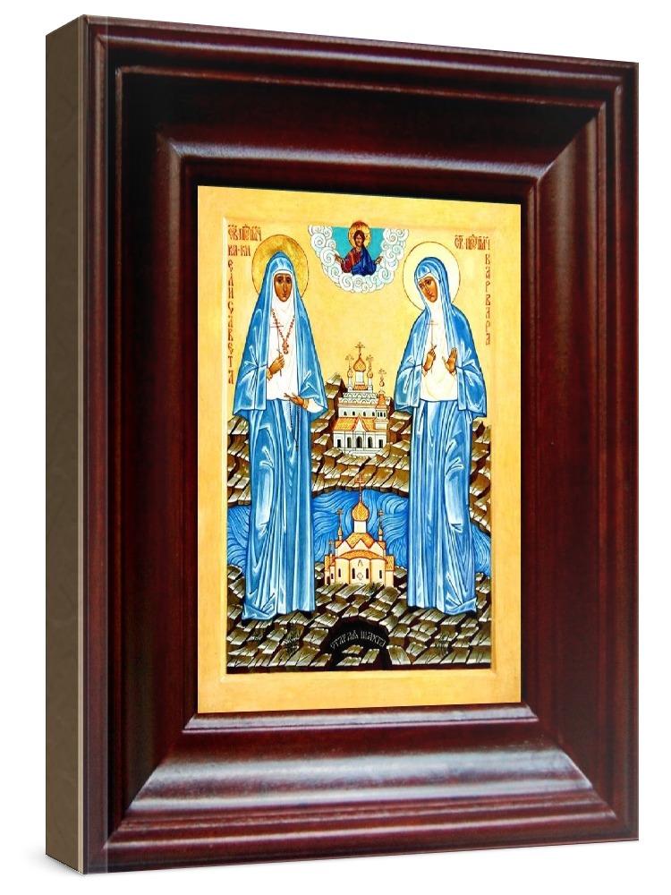 Икона елизавета и варвара (21х24), простой киот. Лик нанесен методом шелкографии на цельную липовую доску, покрытую левкасом (специальным грунтом под живопись). Использованы минеральные (природные) краски. Размер иконы без киота (см): 13х16, с киотом: 21х24. Киот со стеклом, выполнен из березы. Икона освящена.