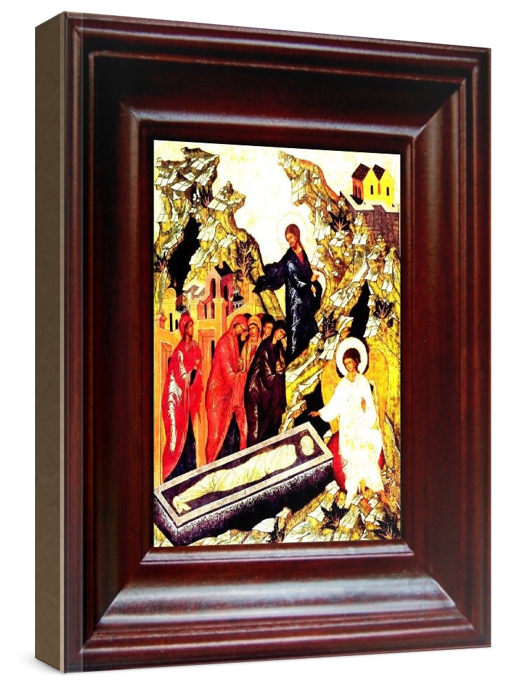 Икона жены мироносицы (21х24), простой киот. Лик нанесен методом шелкографии на цельную липовую доску, покрытую левкасом (специальным грунтом под живопись). Использованы минеральные (природные) краски. Размер иконы без киота (см): 13х16, с киотом: 21х24. Киот со стеклом, выполнен из березы. Икона освящена.