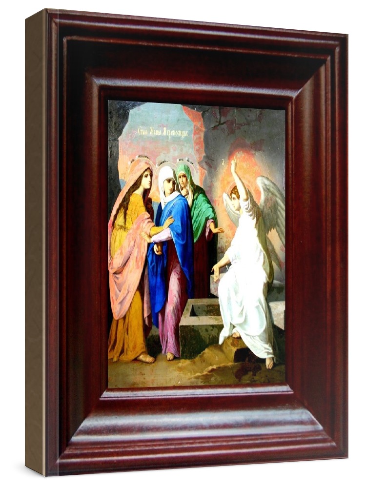 Икона жены мироносицы (21х24), простой киот. Лик нанесен методом шелкографии на цельную липовую доску, покрытую левкасом (специальным грунтом под живопись). Использованы минеральные (природные) краски. Размер иконы без киота (см): 13х16, с киотом: 21х24. Киот со стеклом, выполнен из березы. Икона освящена.