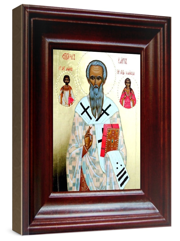 Икона карп, апостол от 70-ти (21х24), простой киот. Лик нанесен методом шелкографии на цельную липовую доску, покрытую левкасом (специальным грунтом под живопись). Использованы минеральные (природные) краски. Размер иконы без киота (см): 13х16, с киотом: 21х24. Киот со стеклом, выполнен из березы. Икона освящена.