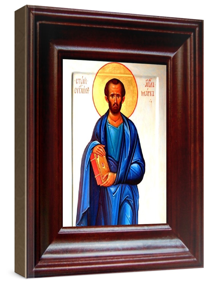 Икона марк, апостол (21х24), простой киот. Лик нанесен методом шелкографии на цельную липовую доску, покрытую левкасом (специальным грунтом под живопись). Использованы минеральные (природные) краски. Размер иконы без киота (см): 13х16, с киотом: 21х24. Киот со стеклом, выполнен из березы. Икона освящена.