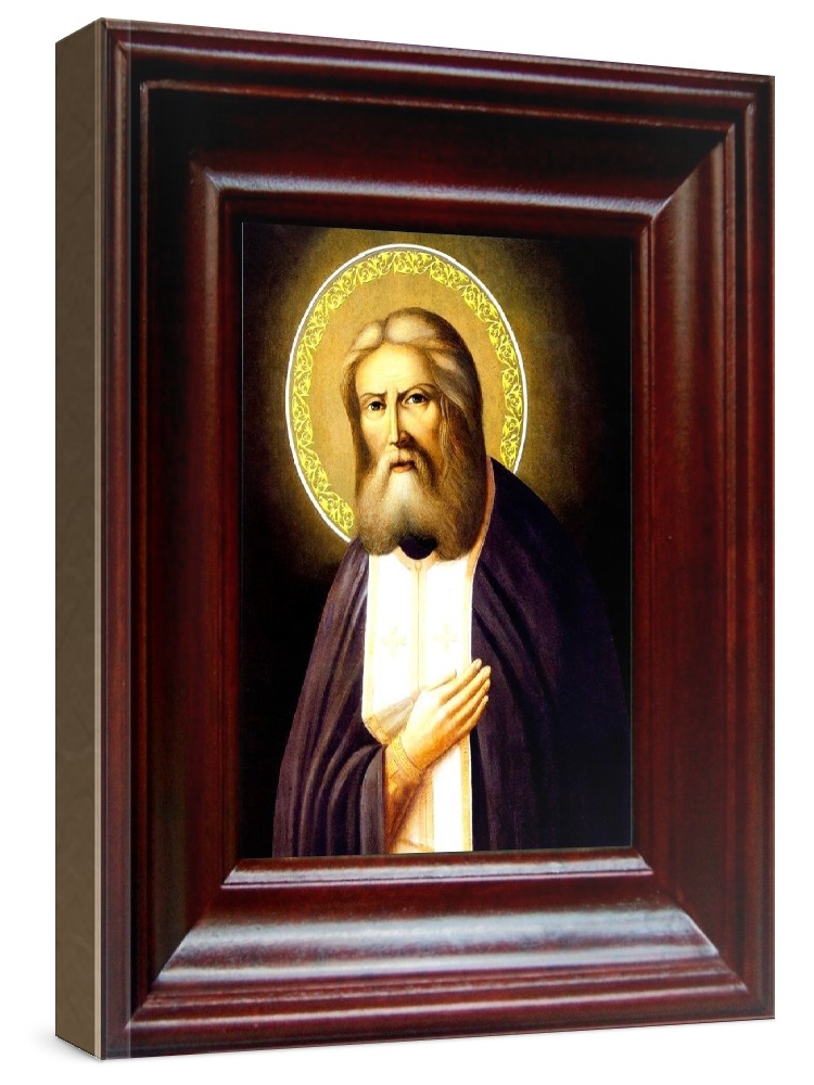 Икона серафим саровский (21х24), простой киот. Лик нанесен методом шелкографии на цельную липовую доску, покрытую левкасом (специальным грунтом под живопись). Использованы минеральные (природные) краски. Размер иконы без киота (см): 13х16, с киотом: 21х24. Киот со стеклом, выполнен из березы. Икона освящена.