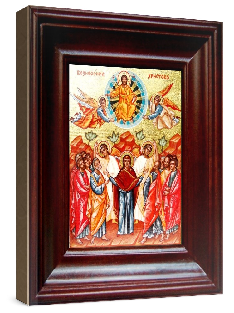 Икона вознесение господне (21х24), простой киот. Лик нанесен методом шелкографии на цельную липовую доску, покрытую левкасом (специальным грунтом под живопись). Использованы минеральные (природные) краски. Размер иконы без киота (см): 13х16, с киотом: 21х24. Киот со стеклом, выполнен из березы. Икона освящена.