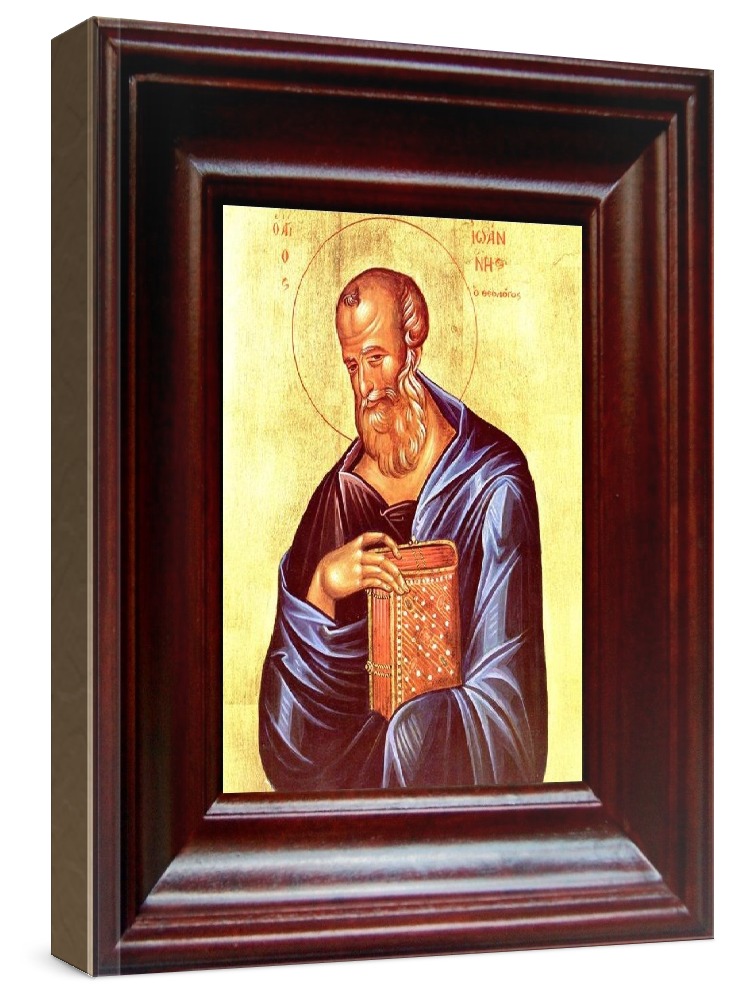 Икона иоанн богослов (21х24), простой киот. Лик нанесен методом шелкографии на цельную липовую доску, покрытую левкасом (специальным грунтом под живопись). Использованы минеральные (природные) краски. Размер иконы без киота (см): 13х16, с киотом: 21х24. Киот со стеклом, выполнен из березы. Икона освящена.