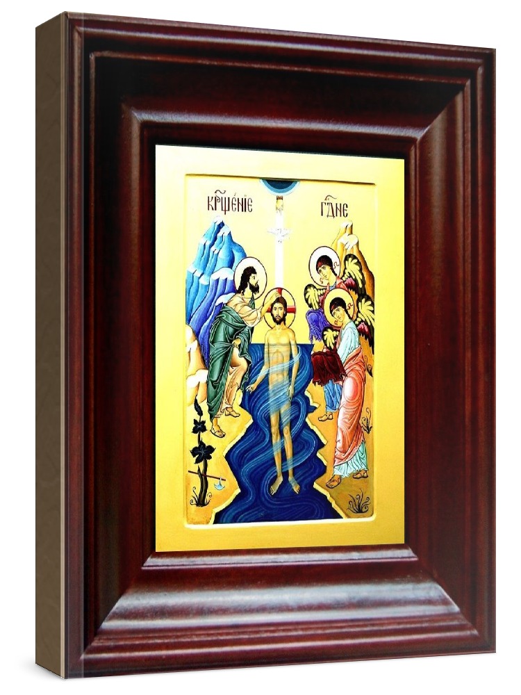 Икона крещение господне (21х24), простой киот. Лик нанесен методом шелкографии на цельную липовую доску, покрытую левкасом (специальным грунтом под живопись). Использованы минеральные (природные) краски. Размер иконы без киота (см): 13х16, с киотом: 21х24. Киот со стеклом, выполнен из березы. Икона освящена.