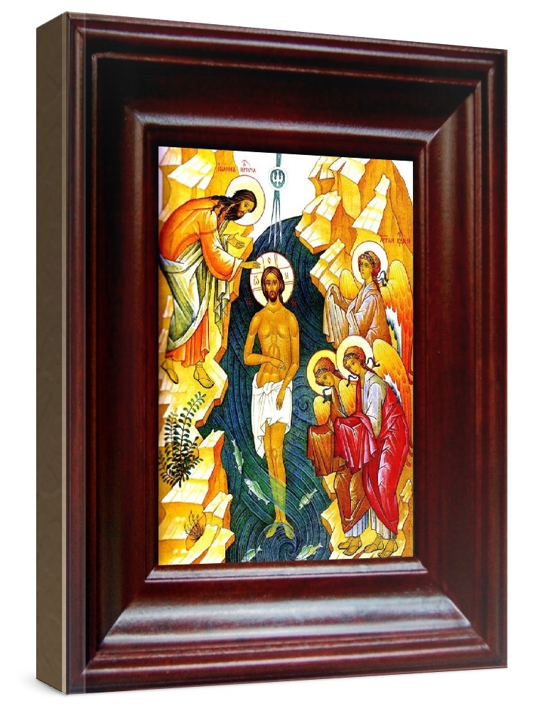 Икона крещение господне (21х24), простой киот. Лик нанесен методом шелкографии на цельную липовую доску, покрытую левкасом (специальным грунтом под живопись). Использованы минеральные (природные) краски. Размер иконы без киота (см): 13х16, с киотом: 21х24. Киот со стеклом, выполнен из березы. Икона освящена.