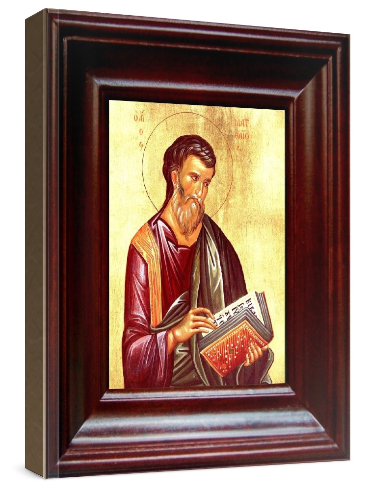 Икона матфей, апостол (21х24), простой киот. Лик нанесен методом шелкографии на цельную липовую доску, покрытую левкасом (специальным грунтом под живопись). Использованы минеральные (природные) краски. Размер иконы без киота (см): 13х16, с киотом: 21х24. Киот со стеклом, выполнен из березы. Икона освящена.