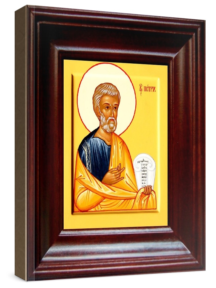 Икона петр, апостол (21х24), простой киот. Лик нанесен методом шелкографии на цельную липовую доску, покрытую левкасом (специальным грунтом под живопись). Использованы минеральные (природные) краски. Размер иконы без киота (см): 13х16, с киотом: 21х24. Киот со стеклом, выполнен из березы. Икона освящена.