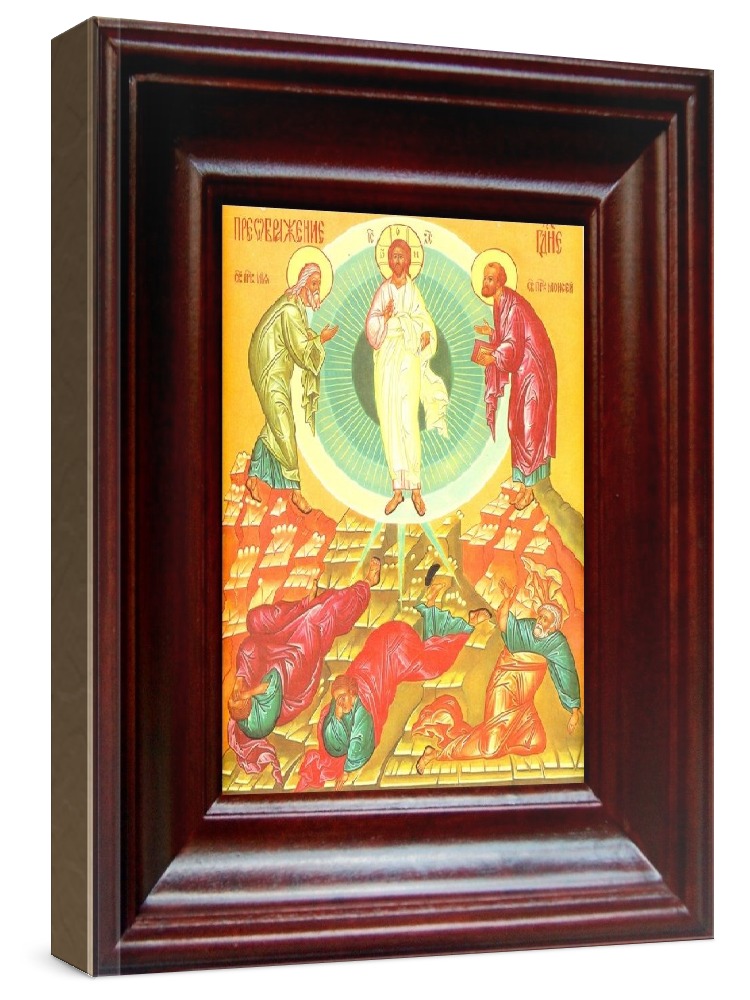 Икона преображение господне (21х24), простой киот. Лик нанесен методом шелкографии на цельную липовую доску, покрытую левкасом (специальным грунтом под живопись). Использованы минеральные (природные) краски. Размер иконы без киота (см): 13х16, с киотом: 21х24. Киот со стеклом, выполнен из березы. Икона освящена.