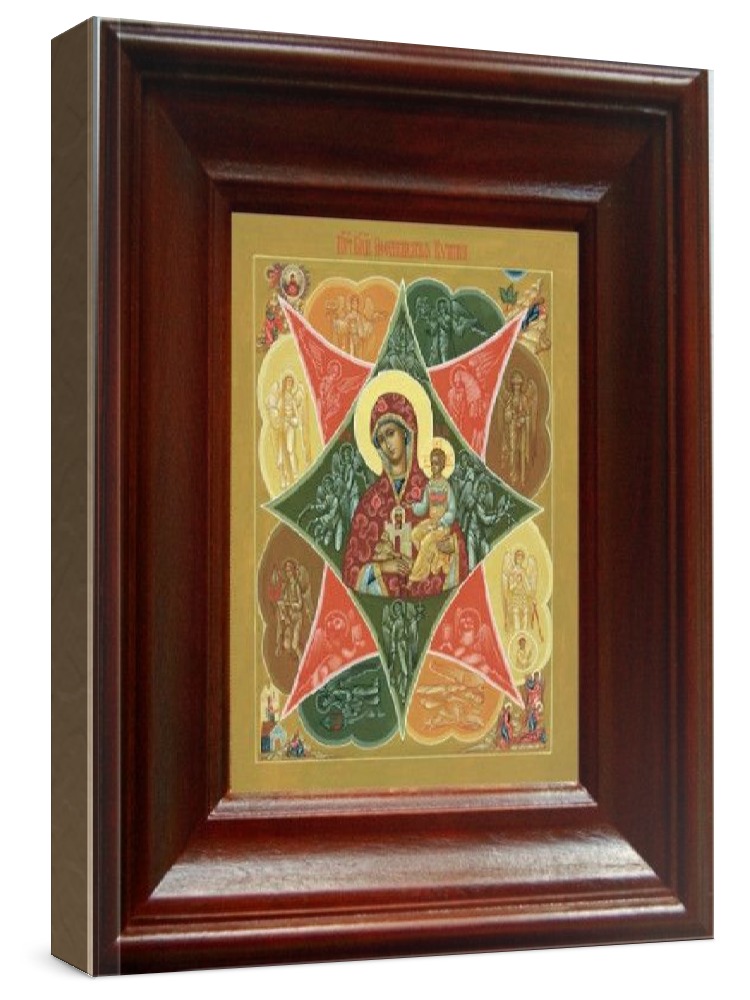 Икона неопалимая купина (21х24), простой киот. Лик нанесен методом шелкографии на цельную липовую доску, покрытую левкасом (специальным грунтом под живопись). Использованы минеральные (природные) краски. Размер иконы без киота (см): 13х16, с киотом: 21х24. Киот (рамка) выполнен из березы. Икона освящена.