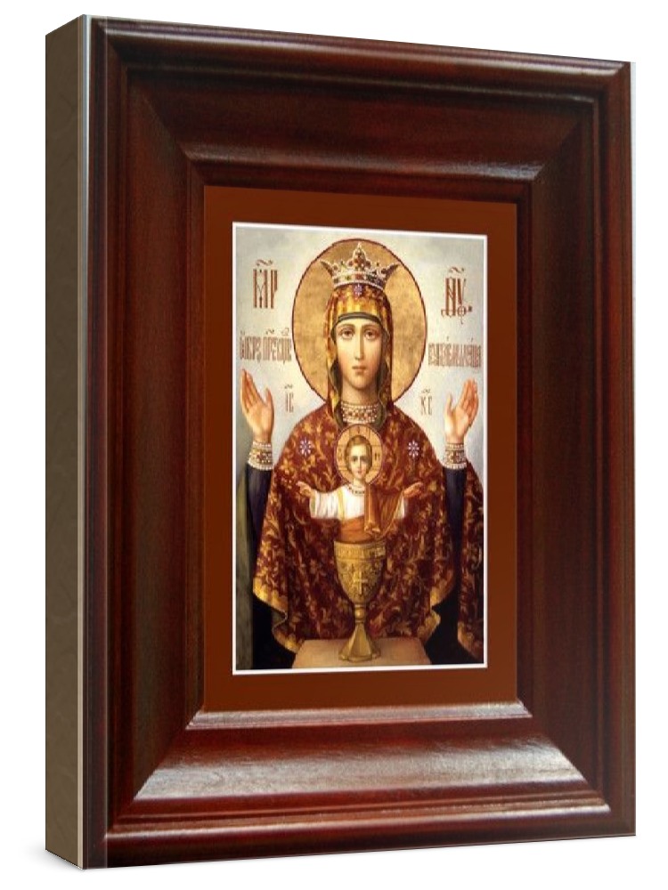 Икона неупиваемая чаша (21х24), простой киот. Лик нанесен методом шелкографии на цельную липовую доску, покрытую левкасом (специальным грунтом под живопись). Использованы минеральные (природные) краски. Размер иконы без киота (см): 13х16, с киотом: 21х24. Киот (рамка) выполнен из березы. Икона освящена.