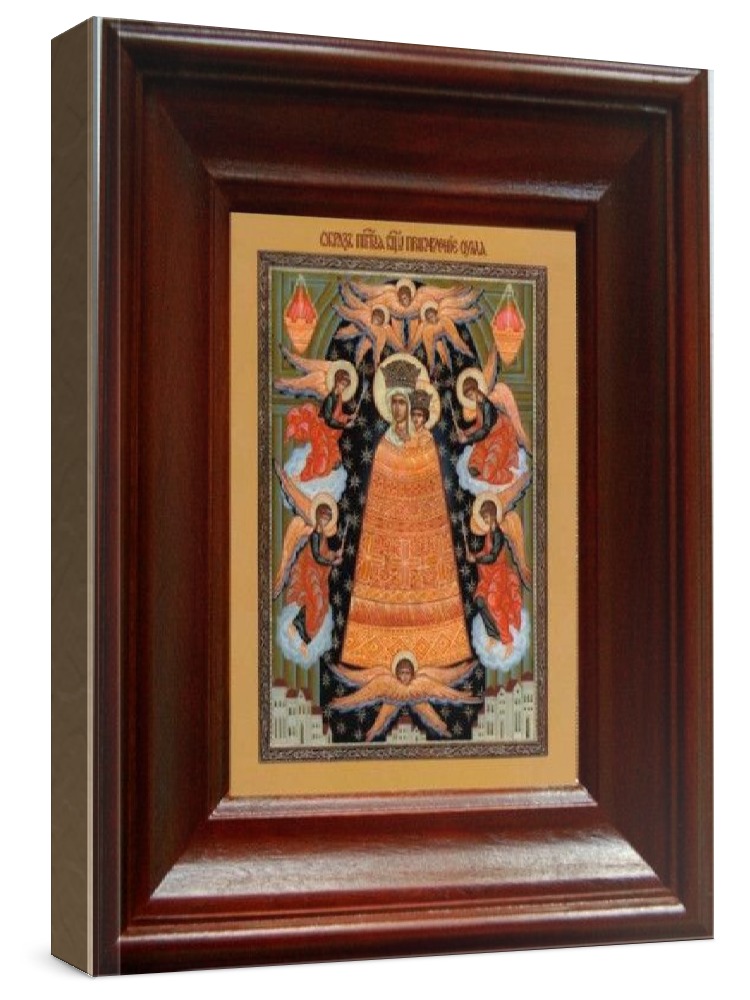 Икона прибавление ума (21х24), простой киот. Лик нанесен методом шелкографии на цельную липовую доску, покрытую левкасом (специальным грунтом под живопись). Использованы минеральные (природные) краски. Размер иконы без киота (см): 13х16, с киотом: 21х24. Киот (рамка) выполнен из березы. Икона освящена.