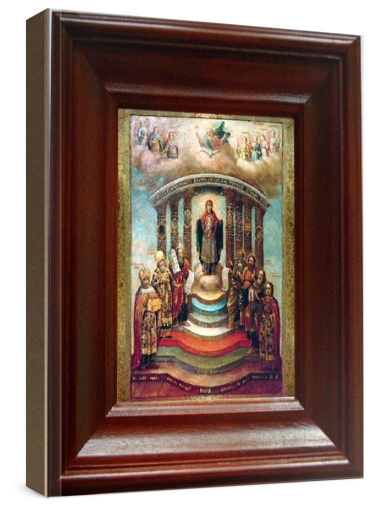 Икона софия - премудрость божия (21х24), простой киот. Лик нанесен методом шелкографии на цельную липовую доску, покрытую левкасом (специальным грунтом под живопись). Использованы минеральные (природные) краски. Размер иконы без киота (см): 13х16, с киотом: 21х24. Киот (рамка) выполнен из березы. Икона освящена.