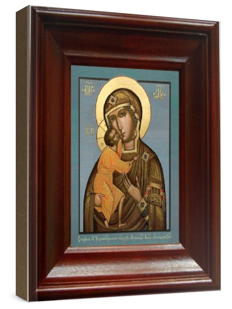 Феодоровская икона бм (21х24), простой киот. Лик нанесен методом шелкографии на цельную липовую доску, покрытую левкасом (специальным грунтом под живопись). Использованы минеральные (природные) краски. Размер иконы без киота (см): 13х16, с киотом: 21х24. Киот (рамка) выполнен из березы. Икона освящена.