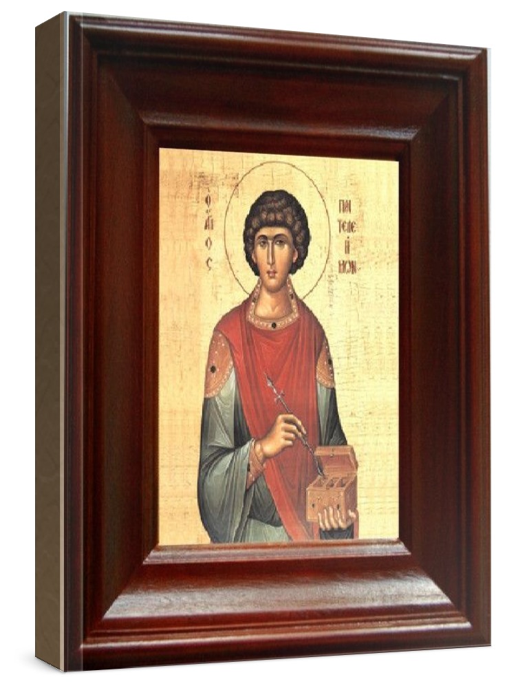 Икона пантелеймон целитель (21х24), простой киот. Лик нанесен методом шелкографии на цельную липовую доску, покрытую левкасом (специальным грунтом под живопись). Использованы минеральные (природные) краски. Размер иконы без киота (см): 13х16, с киотом: 21х24. Киот (рамка) выполнен из березы. Икона освящена.