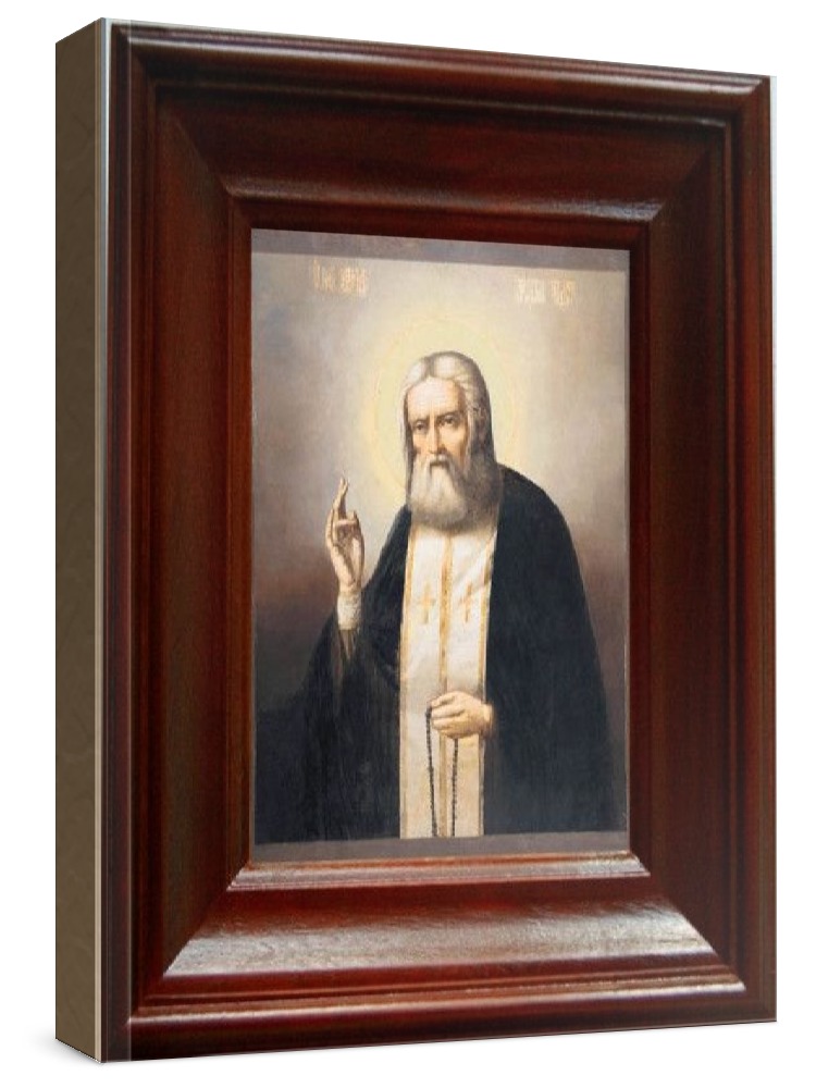 Икона серафим саровский (21х24), простой киот. Лик нанесен методом шелкографии на цельную липовую доску, покрытую левкасом (специальным грунтом под живопись). Использованы минеральные (природные) краски. Размер иконы без киота (см): 13х16, с киотом: 21х24. Киот (рамка) выполнен из березы. Икона освящена.