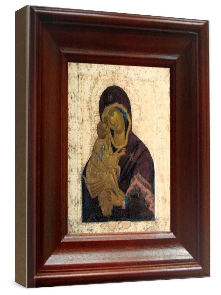 Донская икона бм (21х24), простой киот. Лик нанесен методом шелкографии на цельную липовую доску, покрытую левкасом (специальным грунтом под живопись). Использованы минеральные (природные) краски. Размер иконы без киота (см): 13х16, с киотом: 21х24. Киот (рамка) выполнен из березы. Икона освящена.