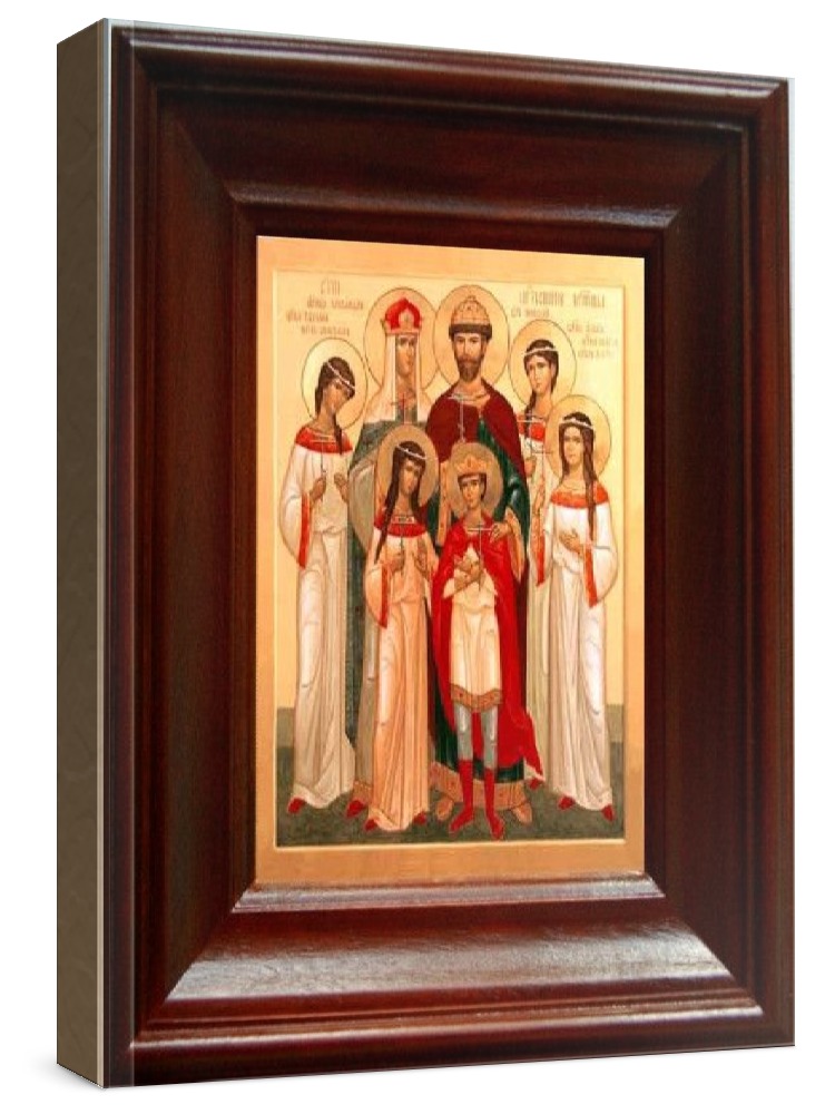 Икона царская семья (21х24), простой киот. Лик нанесен методом шелкографии на цельную липовую доску, покрытую левкасом (специальным грунтом под живопись). Использованы минеральные (природные) краски. Размер иконы без киота (см): 13х16, с киотом: 21х24. Киот (рамка) выполнен из березы. Икона освящена.