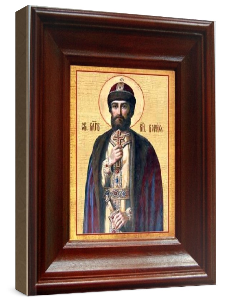 Икона борис, князь (21х24), простой киот. Лик нанесен методом шелкографии на цельную липовую доску, покрытую левкасом (специальным грунтом под живопись). Использованы минеральные (природные) краски. Размер иконы без киота (см): 13х16, с киотом: 21х24. Киот (рамка) выполнен из березы. Икона освящена.