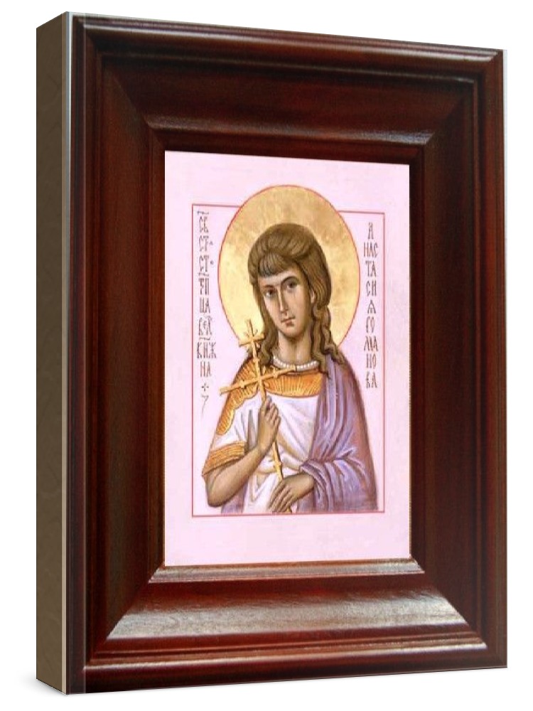 Икона анастасия романова (21х24), простой киот. Лик нанесен методом шелкографии на цельную липовую доску, покрытую левкасом (специальным грунтом под живопись). Использованы минеральные (природные) краски. Размер иконы без киота (см): 13х16, с киотом: 21х24. Киот (рамка) выполнен из березы. Икона освящена.