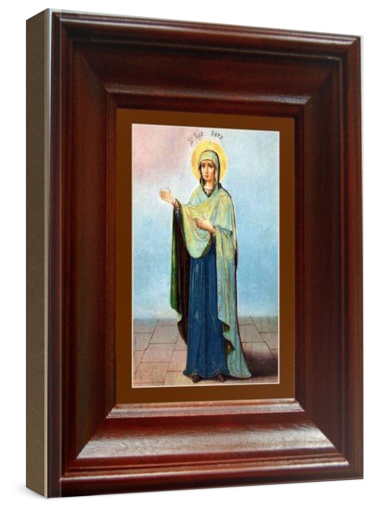 Икона анна пророчица (21х24), простой киот. Лик нанесен методом шелкографии на цельную липовую доску, покрытую левкасом (специальным грунтом под живопись). Использованы минеральные (природные) краски. Размер иконы без киота (см): 13х16, с киотом: 21х24. Киот (рамка) выполнен из березы. Икона освящена.