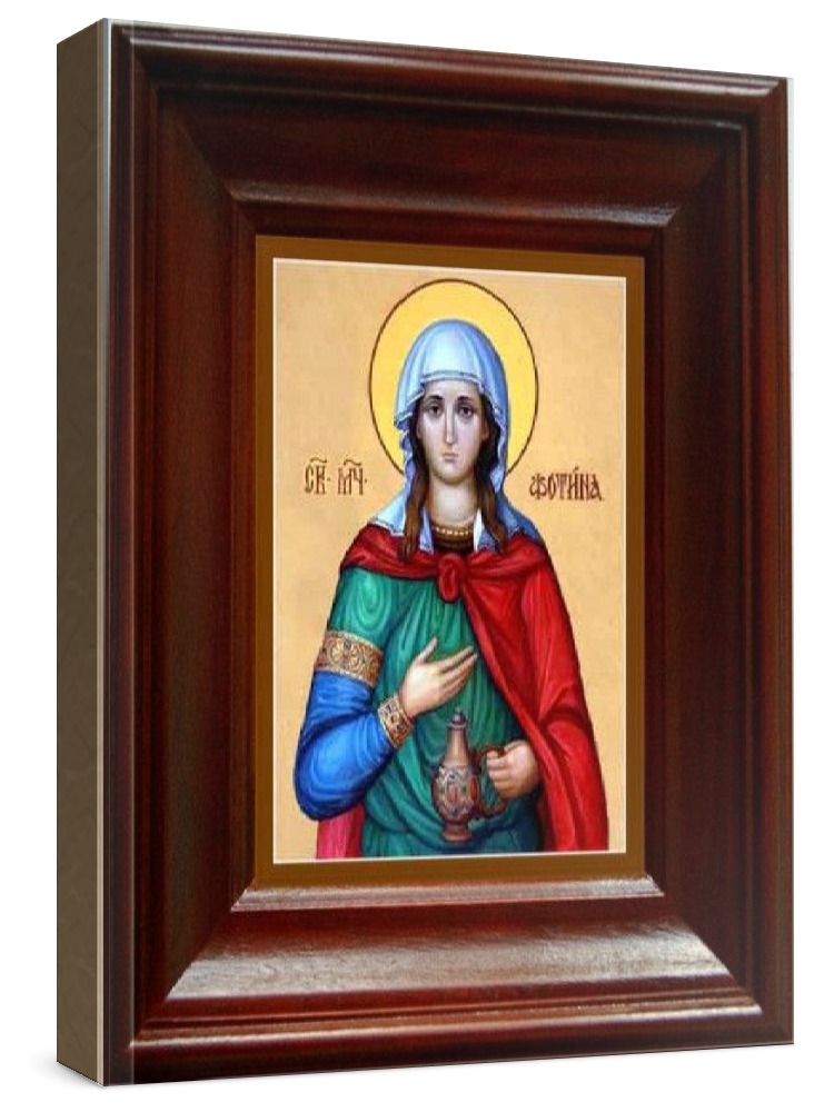 Икона светлана (фотиния) римская (21х24), простой киот. Лик нанесен методом шелкографии на цельную липовую доску, покрытую левкасом (специальным грунтом под живопись). Использованы минеральные (природные) краски. Размер иконы без киота (см): 13х16, с киотом: 21х24. Киот (рамка) выполнен из березы. Икона освящена.