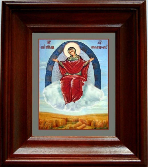 Икона спорительница хлебов (21х24), простой киот. Лик нанесен методом шелкографии на цельную липовую доску, покрытую левкасом (специальным грунтом под живопись). Использованы минеральные (природные) краски. Размер иконы без киота (см): 13х16, с киотом: 21х24. Киот (рамка) выполнен из березы. Икона освящена.