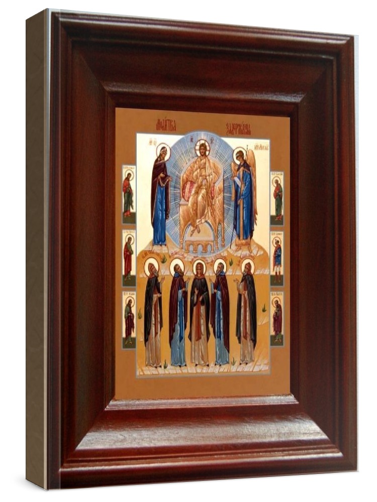 Икона молитва задержания (21х24), простой киот. Лик нанесен методом шелкографии на цельную липовую доску, покрытую левкасом (специальным грунтом под живопись). Использованы минеральные (природные) краски. Размер иконы без киота (см): 13х16, с киотом: 21х24. Киот (рамка) выполнен из березы. Икона освящена.