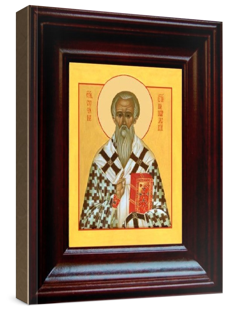 Икона стефан пермский (21х24), простой киот. Лик нанесен методом шелкографии на цельную липовую доску, покрытую левкасом (специальным грунтом под живопись). Использованы минеральные (природные) краски. Размер иконы без киота (см): 13х16, с киотом: 21х24. Киот (рамка) выполнен из березы. Икона освящена.