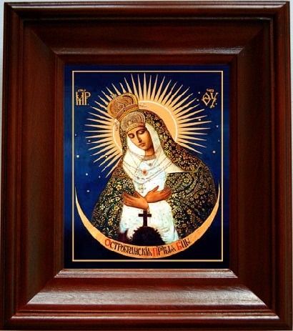 Остробрамская икона бм (21х24), простой киот. Лик нанесен методом шелкографии на цельную липовую доску, покрытую левкасом (специальным грунтом под живопись). Использованы минеральные (природные) краски. Размер иконы без киота (см): 13х16, с киотом: 21х24. Киот (рамка) выполнен из березы. Икона освящена.