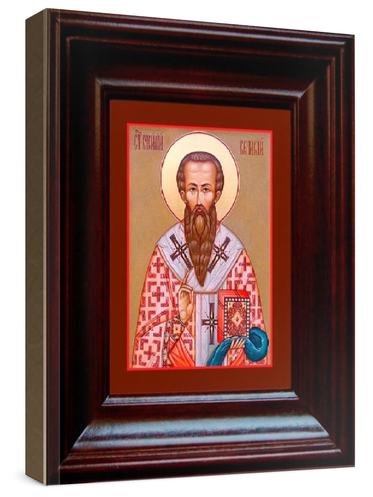 Икона василий великий (21х24), простой киот. Лик нанесен методом шелкографии на цельную липовую доску, покрытую левкасом (специальным грунтом под живопись). Использованы минеральные (природные) краски. Размер иконы без киота (см): 13х16, с киотом: 21х24. Киот (рамка) выполнен из березы. Икона освящена.