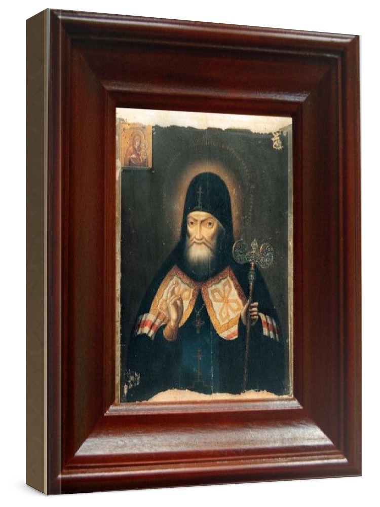 Икона митрофан воронежский (21х24), простой киот. Лик нанесен методом шелкографии на цельную липовую доску, покрытую левкасом (специальным грунтом под живопись). Использованы минеральные (природные) краски. Размер иконы без киота (см): 13х16, с киотом: 21х24. Киот (рамка) выполнен из березы. Икона освящена.