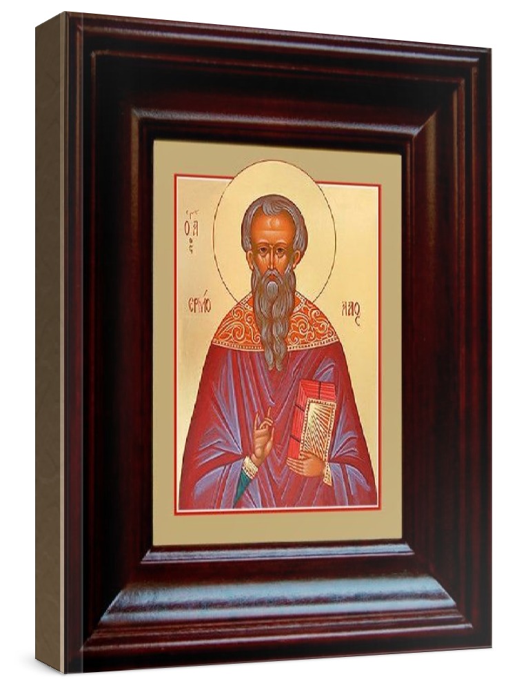 Икона ермолай никомидийский (21х24), простой киот. Лик нанесен методом шелкографии на цельную липовую доску, покрытую левкасом (специальным грунтом под живопись). Использованы минеральные (природные) краски. Размер иконы без киота (см): 13х16, с киотом: 21х24. Киот (рамка) выполнен из березы. Икона освящена.