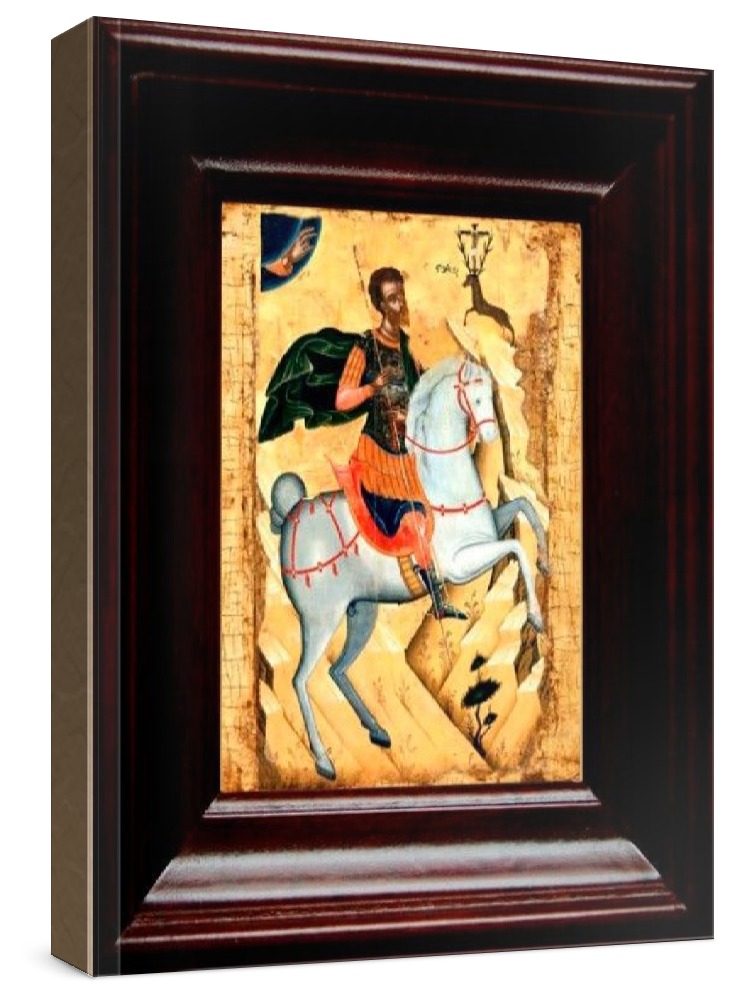 Икона евстафий плакида (21х24), простой киот. Лик нанесен методом шелкографии на цельную липовую доску, покрытую левкасом (специальным грунтом под живопись). Использованы минеральные (природные) краски. Размер иконы без киота (см): 13х16, с киотом: 21х24. Киот (рамка) выполнен из березы. Икона освящена.