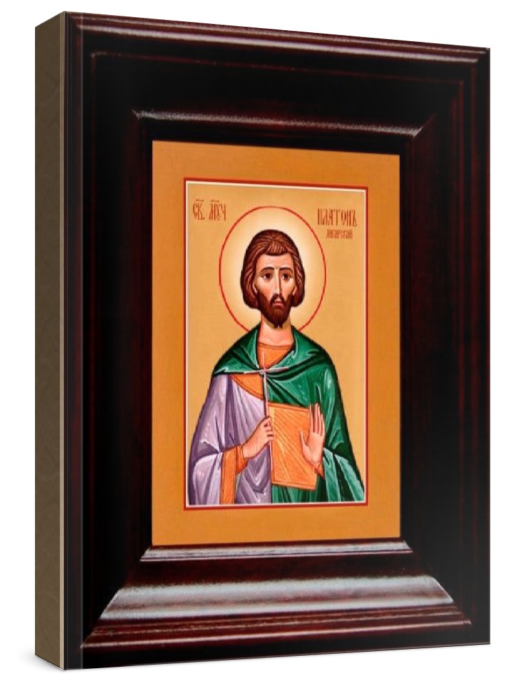 Икона платон анкирский (21х24), простой киот. Лик нанесен методом шелкографии на цельную липовую доску, покрытую левкасом (специальным грунтом под живопись). Использованы минеральные (природные) краски. Размер иконы без киота (см): 13х16, с киотом: 21х24. Киот (рамка) выполнен из березы. Икона освящена.