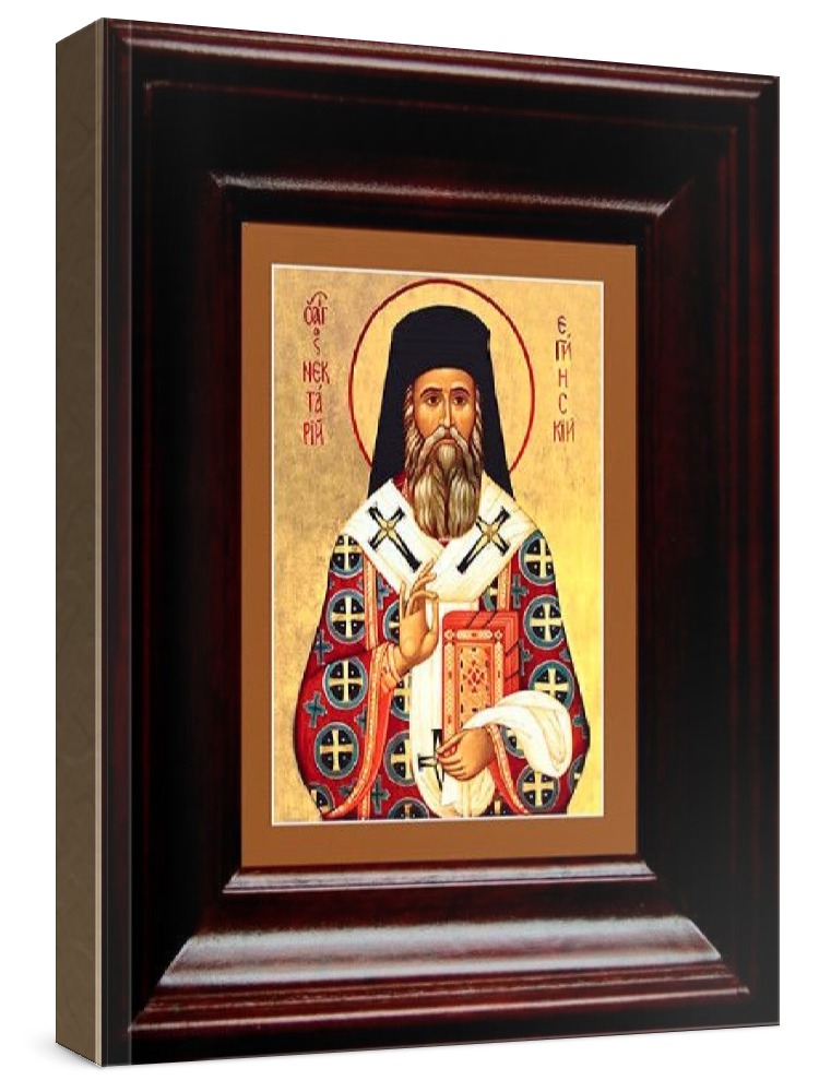 Икона нектарий эгинский (21х24), простой киот. Лик нанесен методом шелкографии на цельную липовую доску, покрытую левкасом (специальным грунтом под живопись). Использованы минеральные (природные) краски. Размер иконы без киота (см): 13х16, с киотом: 21х24. Киот (рамка) выполнен из березы. Икона освящена.