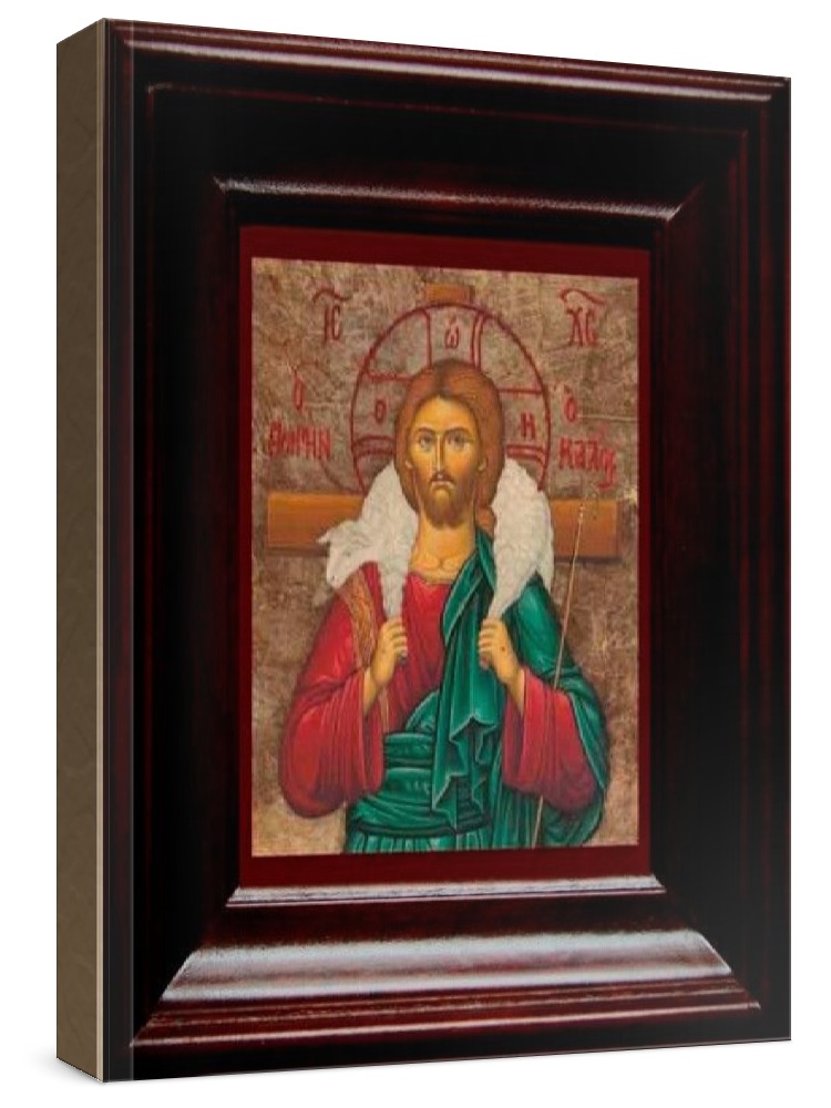 Икона добрый пастырь (21х24), простой киот. Лик нанесен методом шелкографии на цельную липовую доску, покрытую левкасом (специальным грунтом под живопись). Использованы минеральные (природные) краски. Размер иконы без киота (см): 13х16, с киотом: 21х24. Киот (рамка) выполнен из березы. Икона освящена.