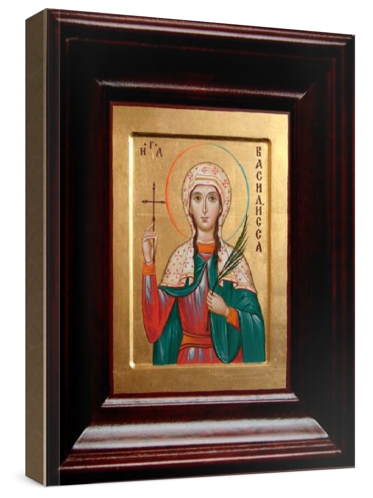 Икона василиса никомидийская (21х24), простой киот. Лик нанесен методом шелкографии на цельную липовую доску, покрытую левкасом (специальным грунтом под живопись). Использованы минеральные (природные) краски. Размер иконы без киота (см): 13х16, с киотом: 21х24. Киот (рамка) выполнен из березы. Икона освящена.