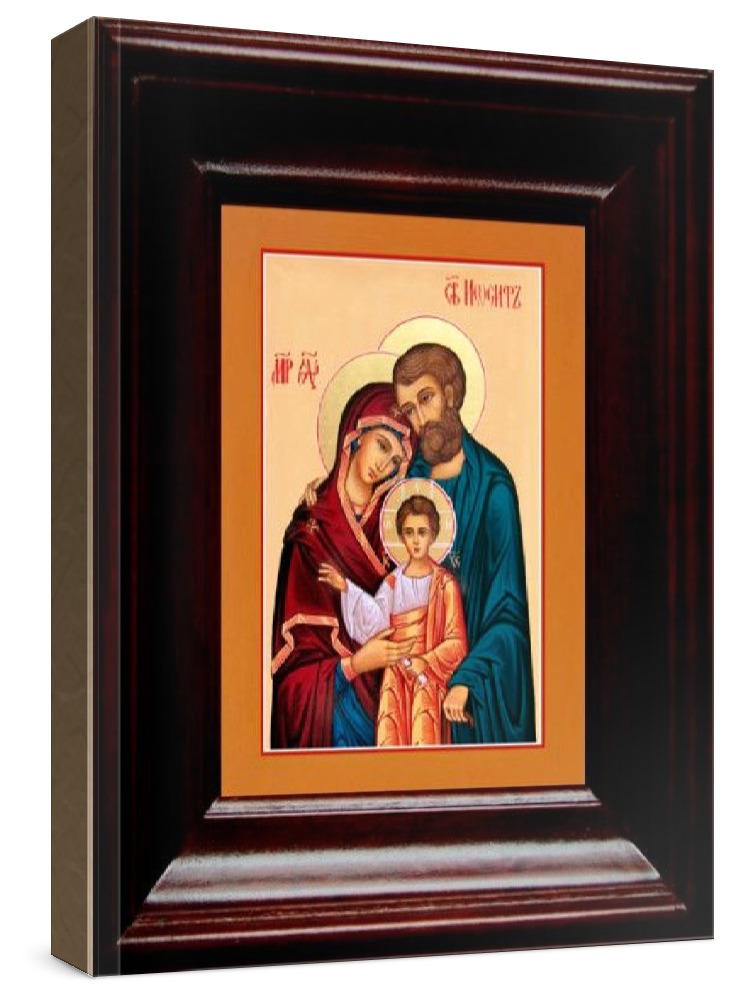 Икона святое семейство (21х24), простой киот. Лик нанесен методом шелкографии на цельную липовую доску, покрытую левкасом (специальным грунтом под живопись). Использованы минеральные (природные) краски. Размер иконы без киота (см): 13х16, с киотом: 21х24. Киот (рамка) выполнен из березы. Икона освящена.